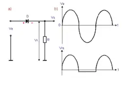 Suivant le sens de branchement de la diode, on supprime soit l'alternance positive, soit l'alternance négative. L'amplitude résiduelle de l'alternance est d'autant plus faible que la résistance de la diode est petite par rapport à la résistance R (diviseur de tension) et que la tension de seuil Vdo est faible. La résistance R ne peut pas être trop grande à cause de l'atténuation du signal. La caractéristique de la diode n'est pas parfaitement linéaire, d'où déformation du signal écrêté. On doit tenir compte du fait que, pour les hautes fréquences, la capacité de la diode constitue avec la résistance R un circuit intégrateur.