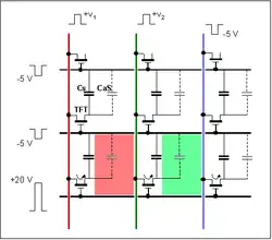 Sa variante TFT est la plus utilisée pour les écrans couleurs, en informatique et pour la télévision. Elle remplace la grille d’électrodes avant par une seule électrode en ITO (oxyde d’indium-étain InxSn(2-x)O3), et la grille arrière par une matrice de transistors en film mince (Thin-film transistor), un par pixel et trois par pixel de couleurs, qui permet de mieux contrôler le maintien de tension de chaque pixel, pour améliorer le temps de réponse et la stabilité de l’affichage.