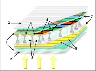 Le principe de base est toujours le même. Il nécessite trois cellules par pixels et le sandwich est complété par un filtre coloré de motifs rouges, verts et bleus. Généralement le filtre est une succession de bandes verticales alternant les trois couleurs. Il y a toutefois d’autres répartitions décalant les couleurs d’une ligne à l’autre.