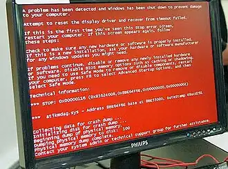 - ↑ RandomProjects2, « Is this rare? I got this Red Screen Of death on my project laptop motherboard, it's a old HP », sur r/computer, (consulté le )