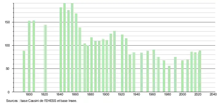 L'évolution du nombre d'habitants est connue à travers les recensements de la population effectués dans la commune depuis 1793. Pour les communes de moins de 10 000 habitants, une enquête de recensement portant sur toute la population est réalisée tous les cinq ans, les populations de référence des années intermédiaires étant quant à elles estimées par interpolation ou extrapolation[14]. Pour la commune, le premier recensement exhaustif entrant dans le cadre du nouveau dispositif a été réalisé en 2006[15].
