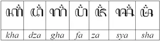Il y a une exception pour les consonnes liquides /l/ et /r/ suivies de la voyelle /ə/ muet, qui sont marquées par des caractères spéciaux. On peut y voir une survivance de l’écriture du sanscrit, langue dans laquelle ces liquides sont des voyelles. Il en va de même pour la consonne /ng/.
