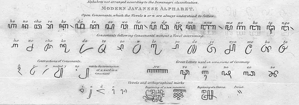 L’écriture javanaise utilise 20 consonnes, correspondant à 20 phonèmes distincts. C'est un alphasyllabaire dans lequel les consonnes se lisent avec la voyelle inhérente /a/. Avec la voyelle inhérente, l'alphabet se récite en formant un poème :