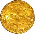 Sur l'avers des écus figuraient les armoiries du royaume de France avec les fleurs de lis : d'abord un « semé » de fleurs de lis, sur l'écu d'or de Saint Louis, les écus d'or à la chaise de Philippe VI et de Jean le Bon, par après un blason aux trois lis sur l'écu d'or de Charles VI en 1385 puis des écus écartelés aux armes de France et de Dauphiné de Louis XI à Louis XIV.