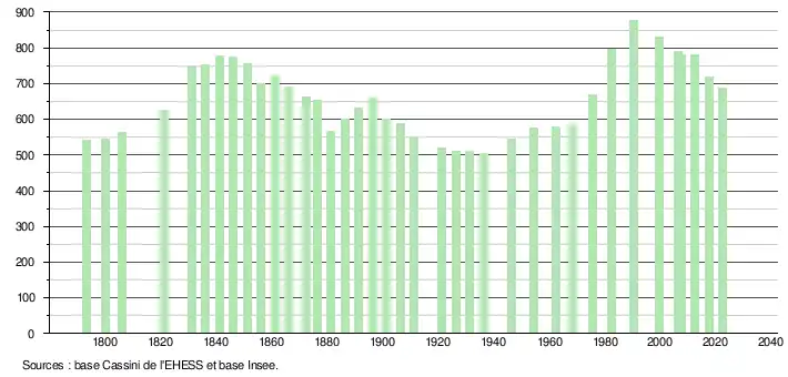 - ↑ Population municipale de référence en vigueur au 1er janvier 2025, millésimée 2022, définie dans les limites territoriales en vigueur au 1er janvier 2024, date de référence statistique : 1er janvier 2022.