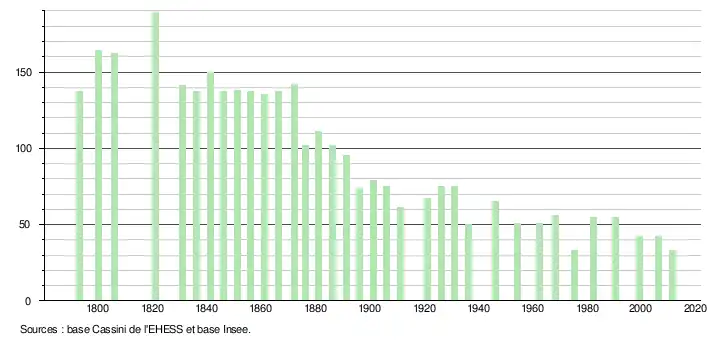 L'évolution du nombre d'habitants est connue à travers les recensements de la population effectués dans la commune depuis 1793. À partir du , les populations légales des communes sont publiées annuellement dans le cadre d'un recensement qui repose désormais sur une collecte d'information annuelle, concernant successivement tous les territoires communaux au cours d'une période de cinq ans. Pour les communes de moins de 10 000 habitants, une enquête de recensement portant sur toute la population est réalisée tous les cinq ans, les populations légales des années intermédiaires étant quant à elles estimées par interpolation ou extrapolation[29]. Pour la commune, le premier recensement exhaustif entrant dans le cadre du nouveau dispositif a été réalisé en 2006[30],[Note 3].