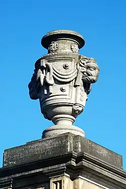 Chacun de ces piliers porte sur sa face antérieure un grand cartouche plat agrémenté à sa base de gouttes (petits pendentifs typiques de l'architecture néoclassique), surmonté de consoles rectangulaires portant un petit entablement, et est sommé d'un vase en pierre orné de têtes d'animaux, d'anneaux et de cordages.