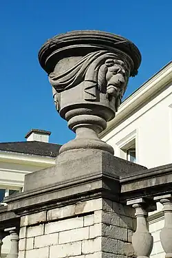 À l'ouest, la balustrade continue cède la place à un mur de clôture en pierre blanche rythmé par une alternance de balustrades, de piliers forts surmontés de statues et de piliers faibles surmontés de vases de pierre ornés de têtes de lion, de draperies et de guirlandes de laurier, semblables aux vases de pierre du mur de clôture du palais, à côté de l'Hôtel de la Liste civile de l'autre côté de la rue Ducale.