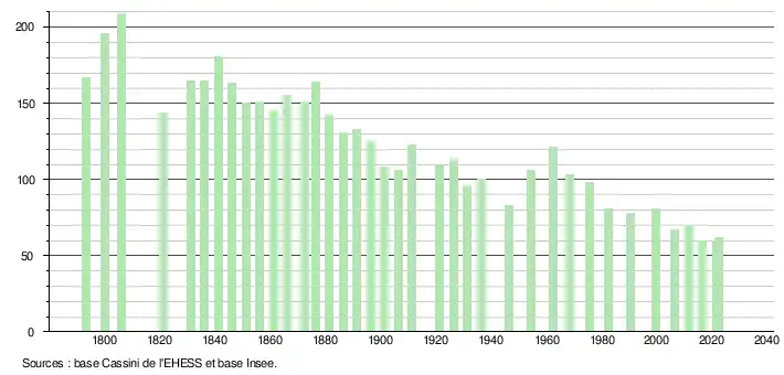 L'évolution du nombre d'habitants est connue à travers les recensements de la population effectués dans la commune depuis 1793. Pour les communes de moins de 10 000 habitants, une enquête de recensement portant sur toute la population est réalisée tous les cinq ans, les populations de référence des années intermédiaires étant quant à elles estimées par interpolation ou extrapolation[34]. Pour la commune, le premier recensement exhaustif entrant dans le cadre du nouveau dispositif a été réalisé en 2006[35].