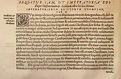 La qualification d'« édit » attachée au document de 313 n'apparaît qu'à la fin du XVIe siècle, dans l'historiographie de la Contre-Réforme, sous la plume de l'historien ecclésiastique Cesare Baronio, quand il cite Eusèbe dans ses Annales ecclésiastiques[26], Baronio puisant lui-même dans une traduction d'Eusèbe par le cistercien anglais John Christopherson[35], qui semble à l'origine du contresens en traduisant le terme διάταξις de l'original grec par le latin edictum[26]. Cesare Baronio utilise cette version latine et, sans revenir au texte grec, fonde son commentaire historique entièrement sur celle-ci, diffusant de la sorte l'erreur et un usage qui devient une norme historiographique[26].