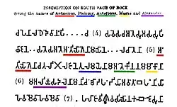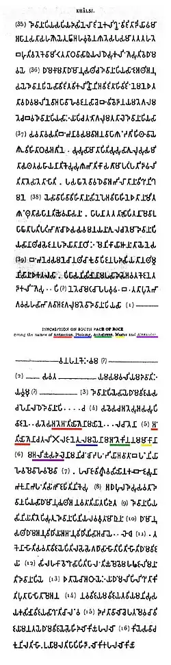 Édit no 13 de l'inscription de Khalsi (deuxième partie), avec la mention des rois hellénistiques Antiochos II, Ptolémée II, Antigone II Gonatas, Magas de Cyrène et Alexandre II d'Épire[1] | |