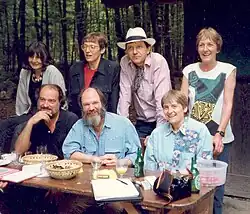 Le comité des Éditions d'en bas lors du 15e anniversaire des éditions en . De gauche à droite : Ursula Gaillard, Elena Urbanovici, Gilbert Musy et Margrit Patrocle (debout) ; Pierre Chessex, Michel Glardon et Marie-Ange Wicky (assis).