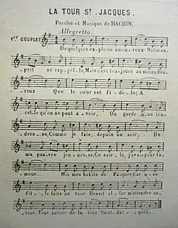 - ↑ Voir les paroles sur Wikisource : la Tour Saint-Jacques. Sur la partition est indiqué que la musique est de Édouard Hachin. elle serait en fait de Joseph Darcier.