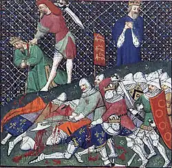 Néanmoins, la plus grande partie de la noblesse ne suit pas le Navarrais et rallie le camp du Dauphin qui assiège Paris. Une alliance avec Étienne Marcel est impossible depuis le meurtre des maréchaux. Charles de Navarre compense ces défections par l'enrôlement de mercenaires anglais dont la présence dans Paris déclenche des émeutes[54], la nouvelle de l'arrivée d'autres troupes anglaises fait définitivement basculer les Parisiens[55] : Étienne Marcel est assassiné et Paris ouvre ses portes au régent le .