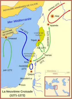 Les chrétiens de Palestine sont dans une situation précaire. Jérusalem est tombée en 1244, et Acre est devenue la capitale d'un royaume chrétien accroché au littoral[52]. Du côté musulman, les Mamelouks baharites mènent une politique agressive sous leur sultan Baybars, menaçant Acre même. Les forces d'Édouard constituent un apport bienvenu à la garnison de la ville, mais elles sont trop peu nombreuses pour inverser le rapport de forces, et leur raid sur Saint-Georges-de-Lebeyne en juin s'avère vain[53]. Une ambassade envoyée aux Mongols de l'Ilkhanat permet de détourner les forces de Baybars grâce à une offensive sur Alep dans le nord[54]. En novembre, Édouard dirige une offensive sur Qaqun (en), sur la route de Jérusalem, mais cette attaque échoue, de même que l'invasion mongole. En , le roi nominal de Jérusalem, Hugues III de Chypre, signe une trêve de dix ans avec Baybars[55]. Édouard n'approuve pas cette démarche, mais il est victime d'une tentative d'assassinat le , et bien qu'il parvienne à tuer son agresseur, il reçoit une blessure au bras qu'on craint empoisonnée, et reste affaibli pendant plusieurs mois[N 3].