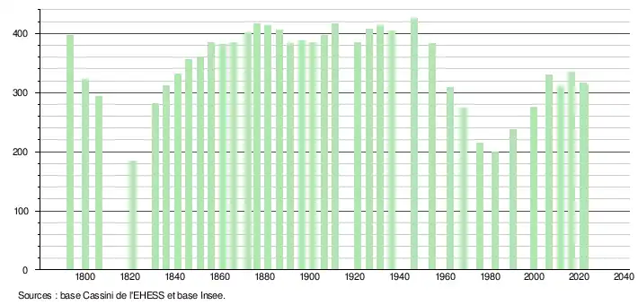 - ↑ Fiches Insee - Populations de référence de la commune pour les années 2006, 2007, 2008, 2009, 2010, 2011, 2012, 2013, 2014, 2015, 2016, 2017, 2018, 2019, 2020, 2021 et 2022.