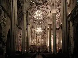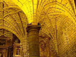 Elle se caractérise aussi par des colonnes très élancées qui supportent directement les voûtes juxtaposées, et dont on a pu dire que, loin de diviser l'espace, elles l'élargissent ; il en résulte une certaine minceur des profils, une rigidité contrastant avec la complication des nervures des voûtes.