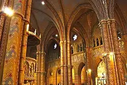 Quant au vaisseau central, en l'absence des fenêtres hautes, il est éclairé indirectement par la lumière provenant des nefs latérales. L'église-halle se rapproche de la conception d'une vaste salle hypostyle voûtée.