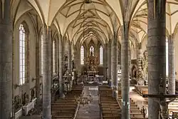 Église-halle échelonnée : la nef centrale est un peu plus haute que les collatéraux, mais elle n'a pas d'étage supplémentaire.