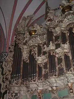 De l’autel, on peut avoir une vue sur le matroneum et l’orgue. Sur les corniches arrondies de la console et des tourelles de basse dans le buffet, il y a les chérubins et les anges soutenant les pages de l’hymnaire et jouant aux instruments. Au centre, il y a une statue du roi biblique David qui joue de la harpe.