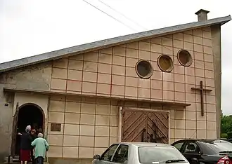 L'église est en forme de halle (rectangulaire) sous un toit à un seul pan[2], ce qui est curieux, laissant imaginer qu'un second pan pourrait être envisagé dans l'éventualité d'un agrandissement de l'église. Le toit est en tôle fibrociment et rien ne laisse imaginer du dehors qu'il s'agit d'un édifice d'architecture sacrée, si ce n'est le pilier de béton sur le toit en forme de cheminée, au bout duquel un discrète croix de métal est scellée.