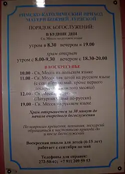 L'église se trouve 7 ruelle de Kovno, près de la perspective Liteïny. Les messes sont célébrées le dimanche à 10 heures (en polonais), onze heures (en russe), midi (en letton) et dix-neuf heures (en russe) et en semaine à 8 heures 30 (en russe) et dix-neuf heures (en russe). Il y a une messe en latin une fois par mois (interrompue depuis la fermeture des frontières entre la Russie et la Biélorussie, le desservant venant de là-bas).