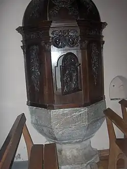 Les stalles sont ornées de panneaux sculptés de personnages allégoriques. Un blason permet de les dater du temps de Philippe de Luxembourg (1486-1519). L'un des panneaux représente aux côtés de saint Jean et de saint Mathieu les donateurs sur un fond de coquille évoquant les pèlerins[6].