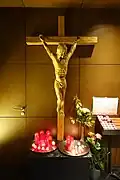 Un Christ en croix mort (Christ Courajod) dans le baptistère manifeste que le baptême associe le chrétien à la mort du Christ. La croix lumineuse, qui lui fait écho dans l'église, rappelle que le baptême associe à la Résurrection du Christ. De manière symbolique, lorsque des obsèques sont célébrées, le corps du défunt est placé au-dessus de ces dalles de verres, à l'exacte verticale du baptistère, manifestant ainsi l'espérance chrétienne que la mort ne constitue qu'un passage déjà réalisé lors du baptême par l'union à la mort et la Résurrection du Christ que celui-ci célèbre.