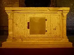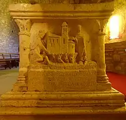 Le revers suggère que l'autel contenait des reliques : une porte donne accès à un espace à l'intérieur de l'autel[12].