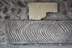 - Dans la chapelle se trouve une plaque en pierre du XVIIe siècle où sont inscrits des mots en latin et un blason avec une tour entourée d'étoiles.