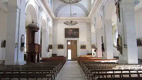 La nef, très lumineuse avec voûte en berceau, est flanquée de deux collatéraux éclairés par des baies vitrées se terminant sur deux chapelles latérales consacrées respectivement à la Vierge et à saint Quentin, second patron de la paroisse. Le chœur est éclairé par une coupole byzantine.
