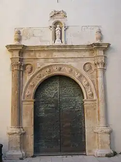 Le portail, clairement baroque, aux lignes simples, est composé de pilastres adossés qui supportent un fronton partagé.