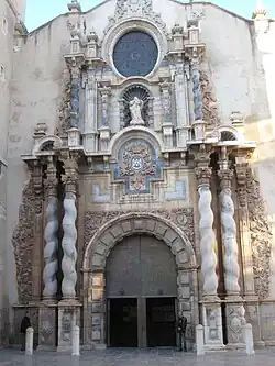 La façade principale baroque a été construite entre les années 1698 et 1702, formant un exemple de façade-retable. Cette façade est divisée en deux corps, un inférieur, pesant et solide, et l'autre supérieur stylisé. Flanquant le portail, dont les jambages et l'intrados présentent des bossages rectangulaires, s'élèvent, sur une base élevée, deux paires de colonnes torses libres, surmontées par des chapiteaux corinthiens de type roman. Des deux côtés, et comme finition extérieure, on trouve un pilastre adossé.
