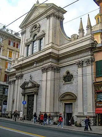 Après la démolition de leur couvent nécessité par le renforcement des murs de la ville, les Augustins obtinrent l'autorisation de la république de Gênes de construire un nouveau couvent à l'endroit où se trouve aujourd'hui l'église actuelle[1],[2]. La construction a eu lieu de 1681 à 1706, mais l'église a été ouverte au culte dès 1693 sous le patronage des familles génoises Durazzo, Della Torre, Canevari et Lercari-Castiglione. En 1769, elle fut dotée d'une coupole conçue par Simone Cantoni. La façade a été construite en 1864[1],[2].