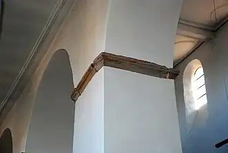 La transition avec le chœur est assurée par un grand arc triomphal[2] dont les piliers latéraux sont également mis en valeur par une imposte de pierre.