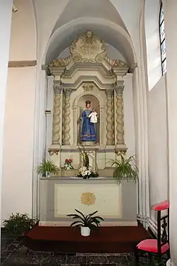 Il ne reste donc des autels d'origine que l'autel du collatéral sud, consacré à Notre-Dame du Rosaire. Cet autel baroque aux couleurs crème et gris comporte une niche cintrée abritant la statue de la Vierge et encadrée de quatre colonnes torses dont les chapiteaux composites supportent un entablement portant un grand cartouche orné du monogramme de Marie, flanqué de cornes d'abondance.