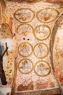 Sous les scènes de l'enfance du Christ, des médaillons représentent quelques apôtres. Seuls subsistent saint Luc, saint Paul et saint Jean l’Évangéliste[6]. Dans l'abside, entourant le Christ, on retrouve les médaillons représentant les évangélistes représentés sous leur forme symbolique : saint Luc en taureau, saint Marc en lion, saint Matthieu en homme et Saint Jean en aigle[7].