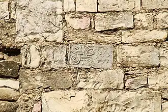 On y trouve, insérée dans la maçonnerie une pierre bleutée sculptée fort ancienne, connue sous le nom d'« entrelacs quadrilobé à trois brins », qui serait peut-être d'époque carolingienne[3],[4]. Cette pierre, martelée sur sa moitié droite, présente sur sa moitié gauche un entrelacs comportant quatre volutes composées de trois brins ainsi que trois petites boucles à un seul brin[5].