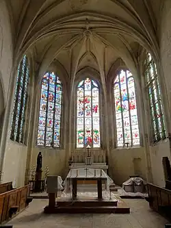 L'abside est traitée sobrement, dans la parfaite continuité stylistique des autres parties flamboyantes, sauf pour le remplage des fenêtres. Grâce à la largeur du vaisseau, il a été possible de prévoir des baies tout aussi larges pour les pans du chevet que pour les parties droites. Les cinq baies, qui ne prennent pas appui sur un mur-bahut, contrairement à l'usage général au XVe siècle, possèdent donc toutes le même remplage de deux formes en plein cintre encadrant une lancette à tête trilobée. Les lobes latérales ne sont, à vrai dire, que des quarts de cercle, et le lobe central correspond aux trois quarts d'un cercle. Ces formes arrondies traduisent la période flamboyante tardive, tandis que les formes en plein cintre sont en usage à la Renaissance. Sur la baie d'axe, des accolades relie la lancette centrale aux arcs en plein cintre qui la flanquent. La modénature des meneaux est toujours aiguë, et ils disposent de bases gothiques. La destination des baies était de recevoir des grandes verrières polychromes, qui sont la principale richesse artistique de l'église (voir le chapitre Mobilier). La voûte est à six branches d'ogives rayonnant autour d'une clé centrale, et à l'instar de la travée précédente, chaque voûtain arbore des liernes et tiercerons et une petite clé secondaire. Les ogives retombent à deux tiers de la hauteur des fenêtres, sans l'effet d'abat-jour que l'on trouve souvent dans les absides à pans étroits, et les formerets se situent à quelque distance du sommet des fenêtres : il n'y a plus, au XVIe siècle, la tendance de faire coïncider l'encadrement des fenêtres avec les formerets et les supports des voûtes.