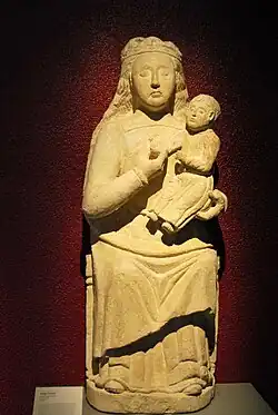 La Vierge n'est pas voilée et porte une couronne discrète, à cabochons ; elle est assise. Elle tient l'Enfant dans sa main gauche et lui tend de sa main droite une pomme.
