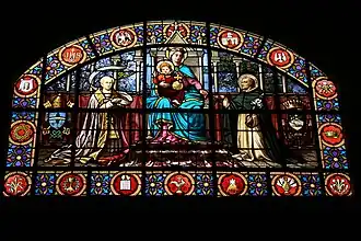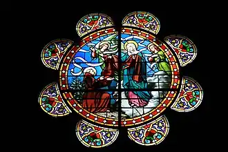Au-dessus du maître-autel, on observe une très belle rosace, ornée en 1871 d’un vitrail d’assez bon style[Par qui ?]. Il représente les patrons des églises et chapelles de l’ancien Bonneval. Au centre, la Vierge (cette partie, brisée lors des bombardements a été remplacée récemment et s’accorde mal avec l’ensemble), au-dessus, le Sauveur ; à gauche saint Michel, saint Martin, saint Maurice et saint Jacques le Majeur ; à droite : saint Roch, saint Jean l’Évangéliste, saint Laurent et saint Gilles.