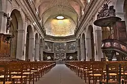 À l’intérieur de l’église, on pénètre dans une large nef longue de 60 mètres, avec voûte en berceau ornée de fenêtres possédant de très beaux vitraux. Ses sept grandes arcades ovales sont surmontées d'une corniche très saillante qui fait le tour du bâtiment.