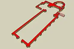 On accède à la sacristie, à la droite de l'autel par ce qui constituait sans doute la partie droite d'un déambulatoire classique autour du chœur. À gauche de l'autel, dans le bras gauche du transept, il existe une absidiole qui pourrait correspondre au débouché gauche de l'ancien déambulatoire.