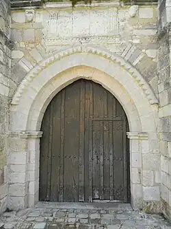 La façade est du XIIe siècle. Elle est soutenue par quatre contreforts massifs. Ils ne sont pas liaisonnés avec les murs ce qui indique qu’ils ont sans doute été construits après coup. En haut des contreforts, le glacis se termine sur un bandeau très élégant. Les teintes différentes des pierres sont le signe qu’elles ne provenaient pas d'une unique carrière mais étaient apportées par les habitants de la région, pendant la construction, au hasard des découvertes. Il y a également des pierres de réemploi, provenant de sarcophages mérovingiens extraits autour de la bâtisse. Le portail est à double rouleaux. Son arc de décharge est d’origine, contrairement au reste du portail, récemment restauré. La présence d'un mélange de lignes arrondies et de lignes droites indique un style romano-grec.
