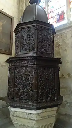 Les fonts baptismaux en bois sculpté font également la renommée de l'édifice[16].
