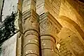 La voussure externe du portail central s'appuie sur des hauts chapiteaux historiés reposant sur des colonnes courtes et larges contrastant avec les colonnettes voisines.