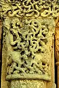 Sur chacune des petites faces de la corbeille on voit un homme sur le dos d'un lion. La face principale et le tailloir du chapiteau foisonnent avec des rinceaux et lianes qui couvrent tout l'espace disponible.