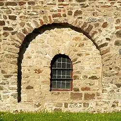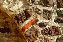 Ici aussi, la partie romane est constituée de moellons assemblés en opus incertum parmi lesquels on distingue des morceaux de tuiles et de briques provenant probablement d'une villa gallo-romaine et utilisés en remploi[5].