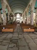 Le vaisseau central, du type à nef obscure, est lambrissée en berceau surbaissée ; les grandes arcades en plein cintre sont supportées par des piliers octogonaux à chapiteaux et leurs clefs de voûte sont ornées de fleurs de lys sculptés[1].