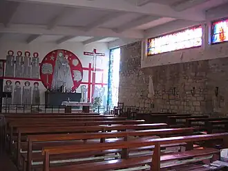 Le mur oriental, derrière l'autel, est couvert d'une fresque de Maurice Calka. Lumineuse, avec des touches rouge vif sur un fond blanc et des traits noirs, elle représente de gauche à droite et de haut en bas plusieurs scènes traditionnellement associées à la Vierge Marie : l'Annonciation, la Visitation, la Nativité, la Présentation de Jésus au Temple, et, tout à droite, la Crucifixion. Juste avant la scène de la cruxifiction, la Vierge est représentée dans un disque rouge, portant son enfant sur son bras gauche, entourée de la symbolisation des quatre éléments, l'air avec le ciel, le feu avec les étoiles, la terre avec l'arbre, l'eau avec le poisson. Les personnages sont représentées de face ou de profil (excepté la nativité, en vue plongeante). Le style et l'encadrement des scènes dans des bandes peuvent évoquer les enluminures romanes. Une verrière de Robert Savary l'éclaire de côté, avec une colombe et des cloches pouvant évoquer Pâques, ou encore la libération de la France et la paix retrouvée[4]. Le mur méridional est percé de baies horizontales, placées en hauteur, sous le plafond, et le mur septentrional de baies verticales. Ces baies apportent la lumière à travers des vitraux, là encore conçus par Robert Savary. Un vitrail en hauteur éclaire également les fonts baptismaux placés à côté de l'entrée[4].
